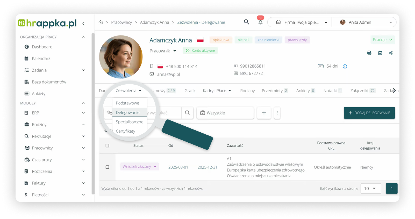 W systemie HRappka przechowasz w jednym miejscu wszystkie dokumenty pracowników delegowanych. Jest to niezwykle istotne, zarówno w przypadku potrzeby znalezienia konkretnych informacji o opiekunce, jak i w trakcie postępowań kontrolnych Państwowej Inspekcji Pracy lub Urzędu Celnego danego kraju.