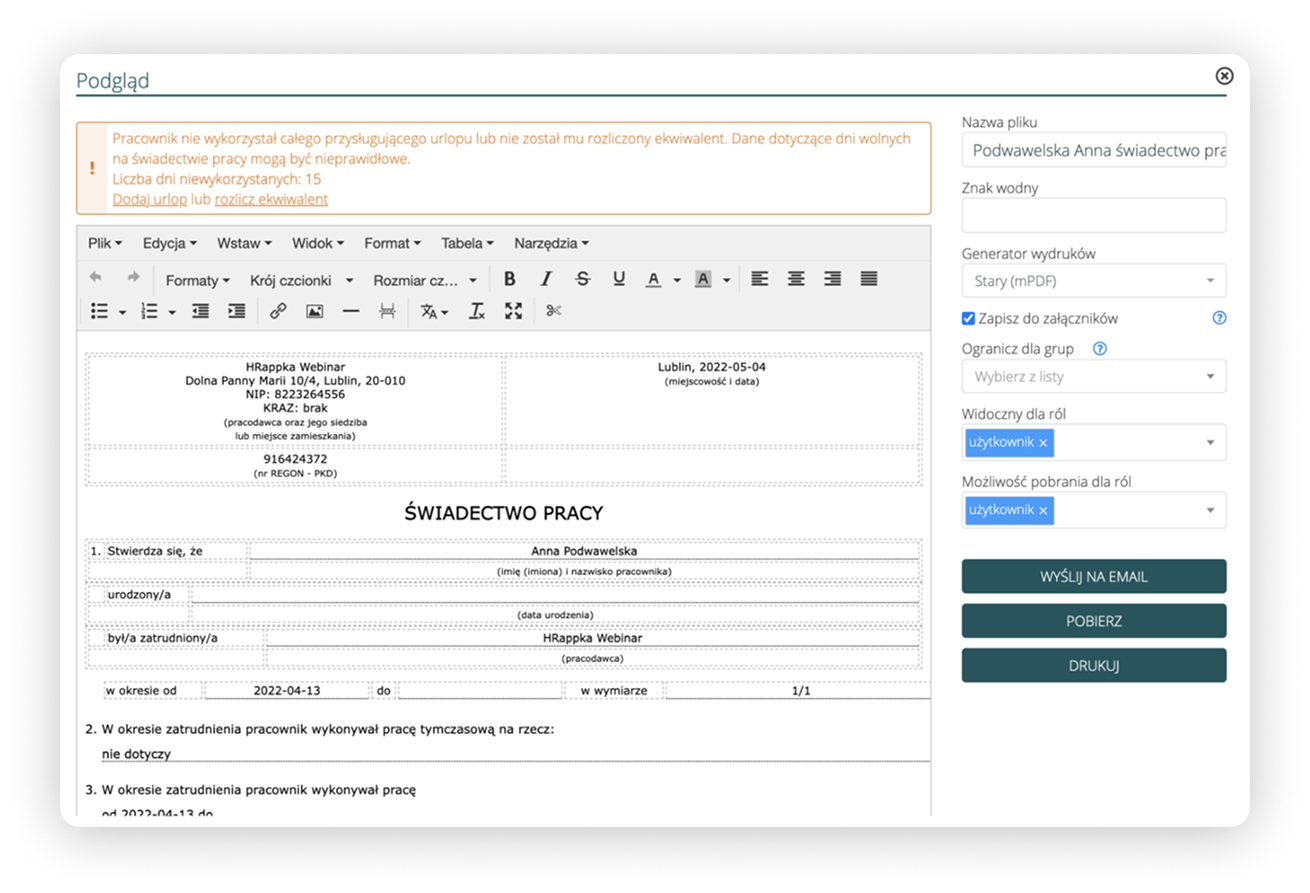Generowanie świadectwa pracy w systemie HRappka