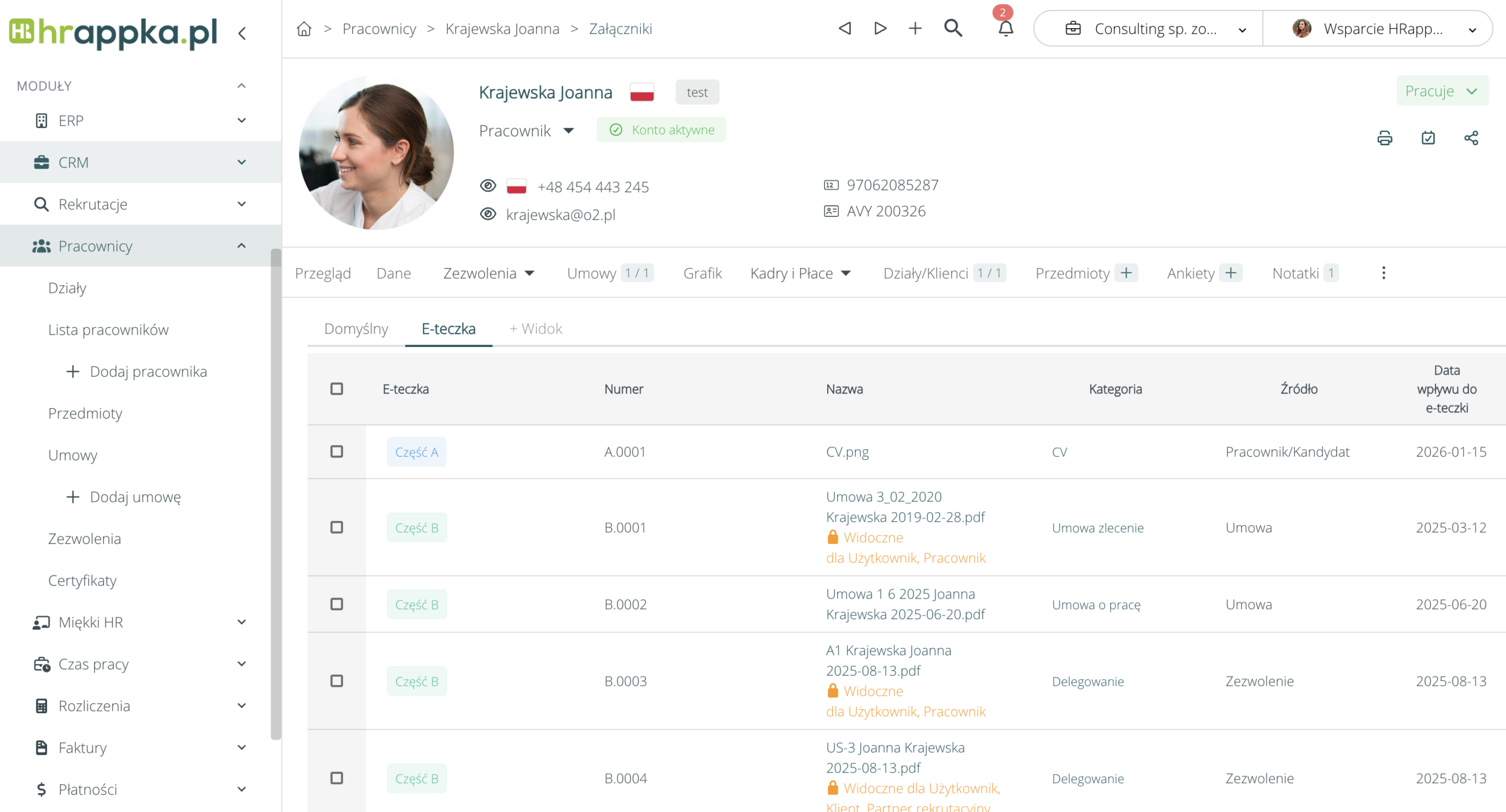 Dzięki tym funkcjom HRappka zwiększa bezpieczeństwo i przejrzystość dokumentacji, oszczędza czas działu HR oraz umożliwia łatwe zarządzanie e-teczkami pracowników w zgodzie z przepisami prawa.
