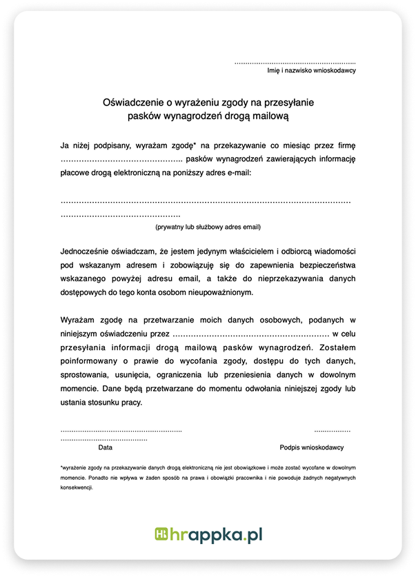 Szablon zgody na przesyłanie pasków płacowych mailem