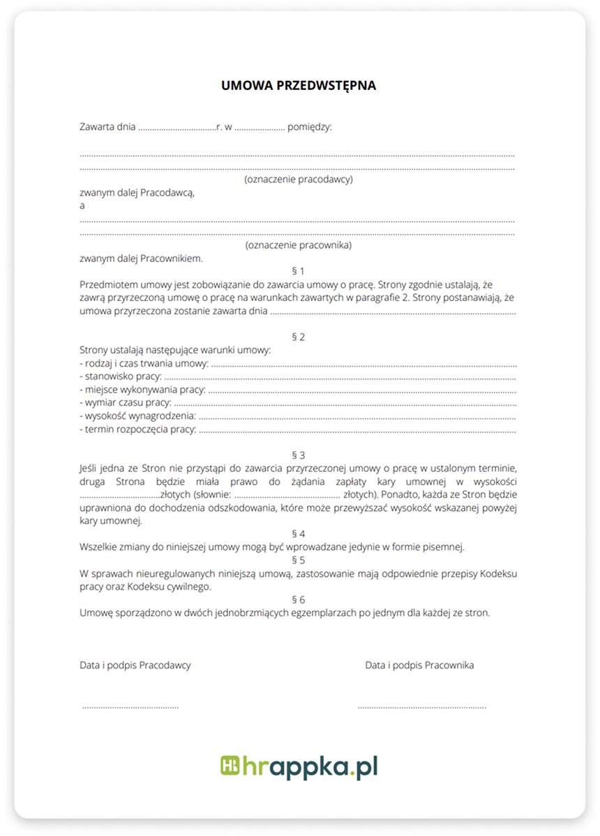 Chcesz zabezpieczyć ustalenia z przyszłym pracownikiem jeszcze przed podpisaniem właściwej umowy o pracę? Przedwstępna umowa o pracę to rozwiązanie, które daje pewność obu stronom – zarówno pracodawcy, jak i kandydatowi – że zatrudnienie dojdzie do skutku na uzgodnionych warunkach i w określonym terminie.